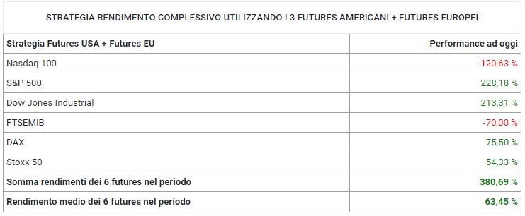 Il rendimento medio dei futures nel periodo è stato del +63,45%. Tra gli indici americani, il Nasdaq 100 ha registrato una performance del -120,63% mentre l'SP 500 è stato il migliore con un +228,18% e il Dow Jones Industrial ha ottenuto un +213,31%. Tra gli indici europei, il Ftse Mib ha registrato un -70,00%, mentre il Dax ha ottenuto un +75,50% e lo Stoxx 50 un +54,33%.
