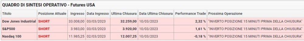 La mia operatività del 10 marzo 2023 sui futures americani è stata la seguente, Le posizioni da cui provenivo sono chiaramente indicate nella tabella sottostante insieme alle indicazioni serali della mia operatività: