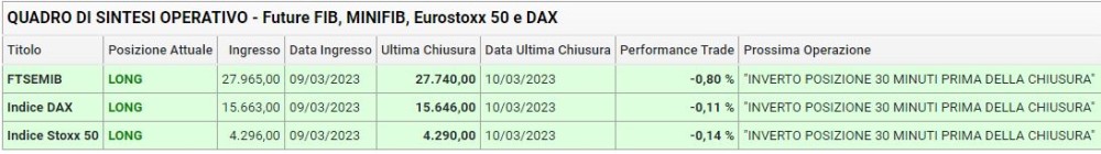 La mia operatività del 10 marzo 2023 sui futures europei è stata la seguente. Le posizioni da cui provenivo sono chiaramente indicate nella tabella sottostante insieme alle indicazioni serali della mia operatività: