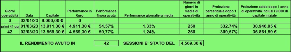 Nel periodo dal 3 gennaio al 2 marzo 2023, ho ottenuto un guadagno complessivo del +50,77% sul mio capitale di € 9.000, portando il mio conto a € 13.569.