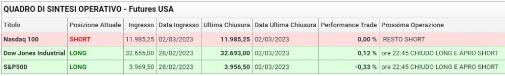 La mia operatività del 2 marzo 2023 sui futures americani è stata la seguente, Le posizioni da cui provenivo sono chiaramente indicate nella tabella sottostante insieme alle indicazioni serali della mia operatività: