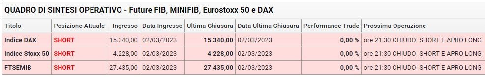 La mia operatività del 2 marzo 2023 sui futures europei è stata la seguente. Le posizioni da cui provenivo sono chiaramente indicate nella tabella sottostante insieme alle indicazioni serali della mia operatività: