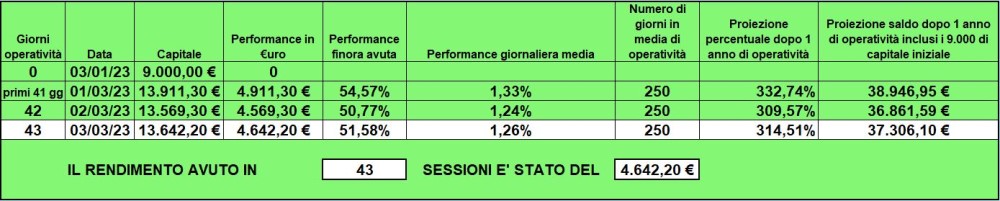 Nel periodo dal 3 gennaio al 3 marzo 2023, ho ottenuto un guadagno complessivo del +51,58% sul mio capitale di € 9.000, portando il mio conto a € 13.642.