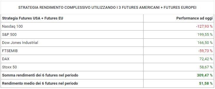 Il rendimento medio dei futures nel periodo è stato del +51,58%. Tra gli indici americani, il Nasdaq 100 ha registrato una performance del -127,93% mentre l'SP 500 è stato il migliore con un +199,55% e il Dow Jones Industrial ha ottenuto un +166,50%. Tra gli indici europei, il Ftse Mib ha registrato un -59,73%, mentre il Dax ha ottenuto un +72,42% e lo Stoxx 50 un +58,67%.
