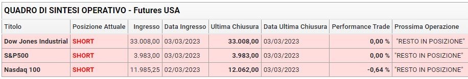 La mia operatività del 3 marzo 2023 sui futures americani è stata la seguente. Le posizioni da cui provenivo sono chiaramente indicate nella tabella sottostante insieme alle indicazioni serali della mia operatività: