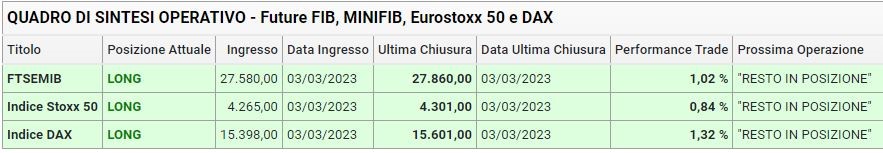 La mia operatività del 3 marzo 2023 sui futures europei è stata la seguente. Le posizioni da cui provenivo sono chiaramente indicate nella tabella sottostante insieme alle indicazioni serali della mia operatività: