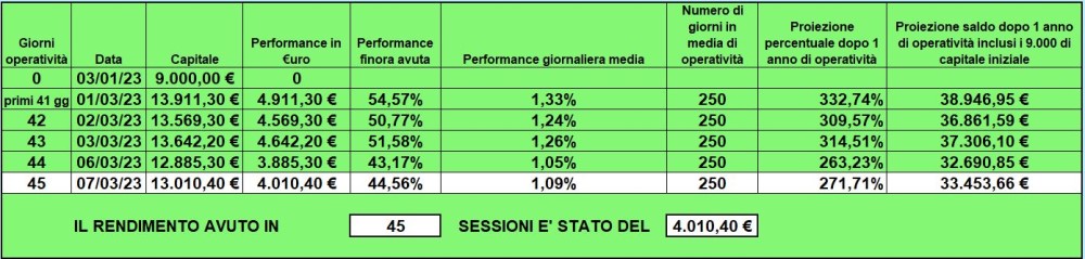 Nel periodo dal 3 gennaio al 8 marzo 2023, ho ottenuto un guadagno complessivo del +53,89% sul mio capitale di € 9.000, portando il mio conto a € 13.850.