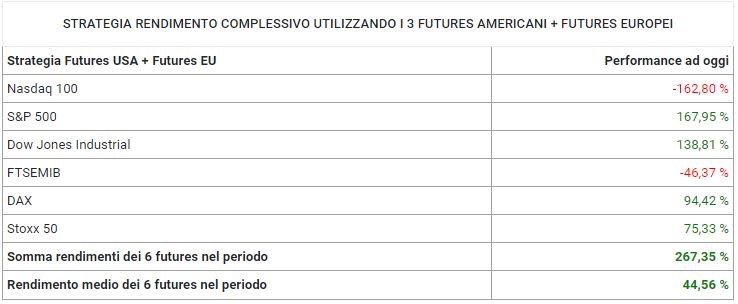 Il rendimento medio dei futures nel periodo è stato del +53,89%. Tra gli indici americani, il Nasdaq 100 ha registrato una performance del -142,20% mentre l'SP 500 è stato il migliore con un +196,48% e il Dow Jones Industrial ha ottenuto un +175,50%. Tra gli indici europei, il Ftse Mib ha registrato un -54,59%, mentre il Dax ha ottenuto un +85,83% e lo Stoxx 50 un +62,33%.