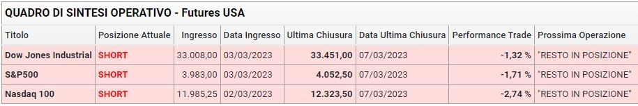 La mia operatività del 7 marzo 2023 sui futures americani è stata la seguente, Le posizioni da cui provenivo sono chiaramente indicate nella tabella sottostante insieme alle indicazioni serali della mia operatività: