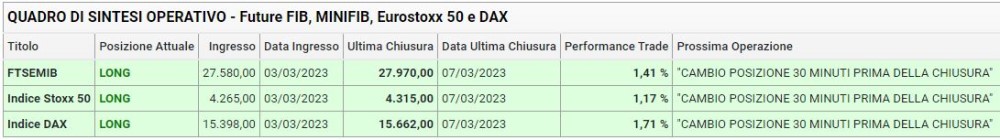 La mia operatività del 8 marzo 2023 sui futures europei è stata la seguente. Le posizioni da cui provenivo sono chiaramente indicate nella tabella sottostante insieme alle indicazioni serali della mia operatività: