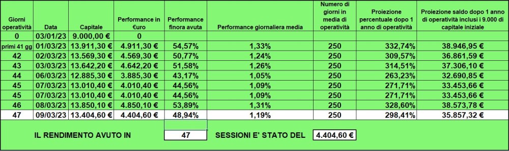 Nel periodo dal 3 gennaio al 9 marzo 2023, ho ottenuto un guadagno complessivo del +48,94% sul mio capitale di € 9.000, portando il mio conto a € 13.404.
