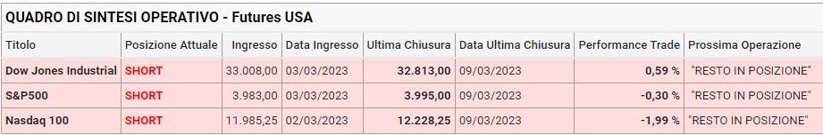 La mia operatività del 9 marzo 2023 sui futures americani è stata la seguente, Le posizioni da cui provenivo sono chiaramente indicate nella tabella sottostante insieme alle indicazioni serali della mia operatività:
