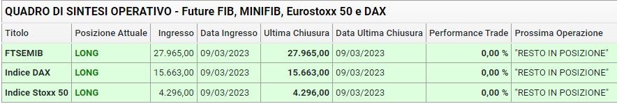 La mia operatività del 9 marzo 2023 sui futures europei è stata la seguente. Le posizioni da cui provenivo sono chiaramente indicate nella tabella sottostante insieme alle indicazioni serali della mia operatività: