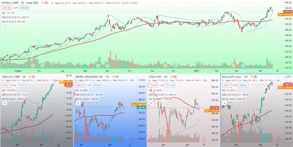 Basandomi sulle indicazioni d’ingresso e sulla gestione dei trades dati nelle analisi precedenti i titoli su cui sto avendo maggior profitto oggi martedì 20 aprile 2021 sono: