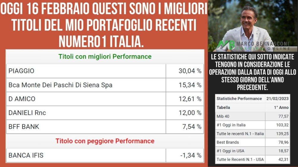 Oggi, 21 Febbraio, i migliori titoli del mio portafoglio Mib 40 Italia sono Piaggio 30,04%, Bca Monte dei Paschi di Siena Spa 15,34%, D'Amico 12,61%, Danieli Rnc 12% e BFF Bank 7,54%. Il titolo con la peggiore performance è stato invece Banca IFIS con una perdita del 1,34%.
