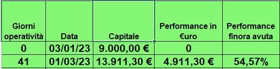 Nel periodo dal 3 gennaio al 1° marzo, ho ottenuto un guadagno complessivo del +54,57% sul mio capitale di € 9.000, portando il mio conto a € 13.911.