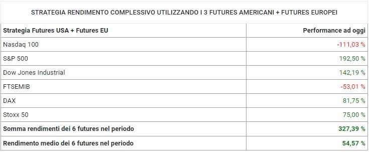 Il rendimento medio dei futures nel periodo è stato del +54,57%. Tra gli indici americani, il Nasdaq 100 ha registrato una performance del -111,03% mentre l'SP 500 è stato il migliore con un +192,50% e il Dow Jones Industrial ha ottenuto un +100,40%. Tra gli indici europei, il Ftse Mib ha registrato un -53,01%, mentre il Dax ha ottenuto un +81,75% e lo Stoxx 50 un +75%.