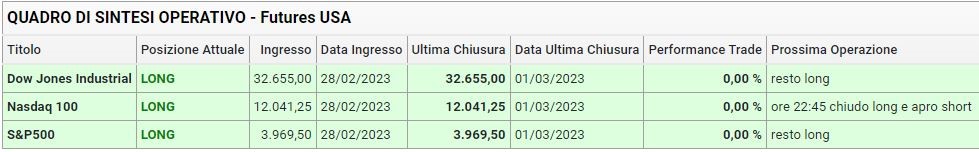 La mia operatività del 1° marzo 2023 sui futures americani è stata la seguente, Le posizioni da cui provenivo sono chiaramente indicate nella tabella sottostante insieme alle indicazioni serali della mia operatività: