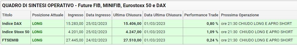 La mia operatività del 1° marzo 2023 sui futures europei è stata la seguente. Le posizioni da cui provenivo sono chiaramente indicate nella tabella sottostante insieme alle indicazioni serali della mia operatività: