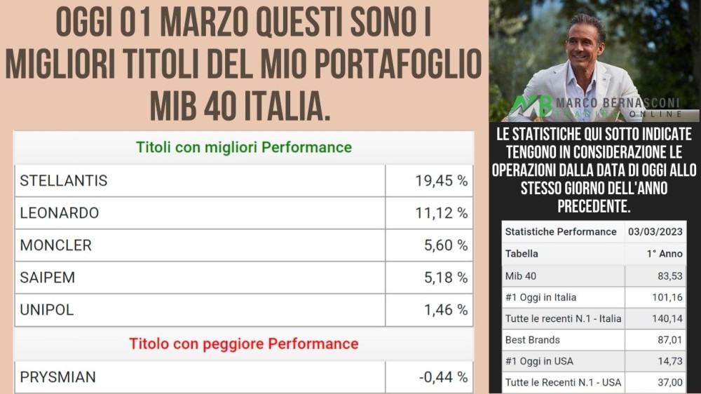 Oggi, 03 Marzo, i migliori titoli del portafoglio Mib 40 Italia di Marco Bernasconi sono: