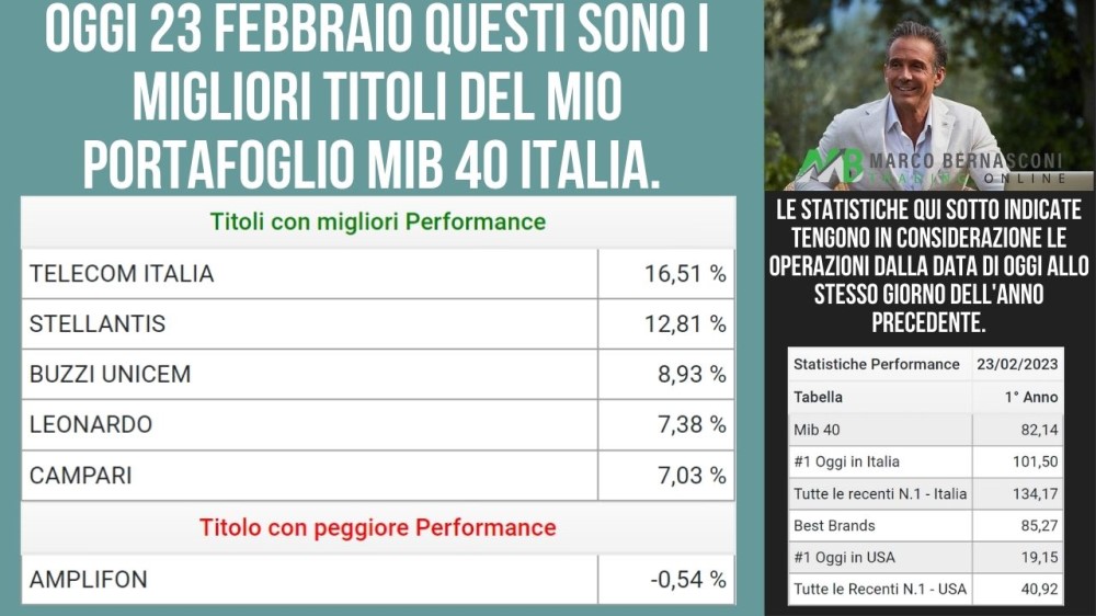 Oggi voglio parlarvi dei titoli del mio portafoglio recenti numero 1 Italia e Mib 40 Italia, che hanno mostrato le migliori performance nel corso della giornata di trading del 23 Febbraio 2023.