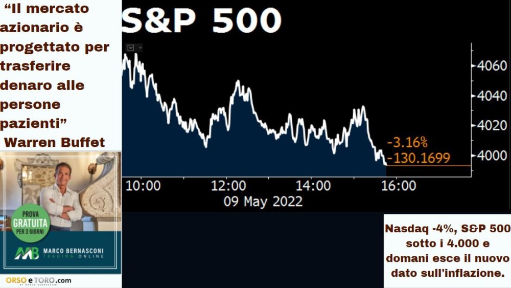 Nasdaq -4%, S&P 500 sotto i 4.000 e domani esce il nuovo dato sull'inflazione.