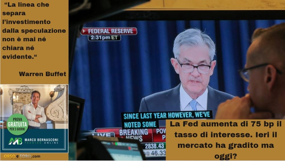 La Fed aumenta di 75 bp il tasso di interesse. Ieri il mercato ha gradito ma oggi?