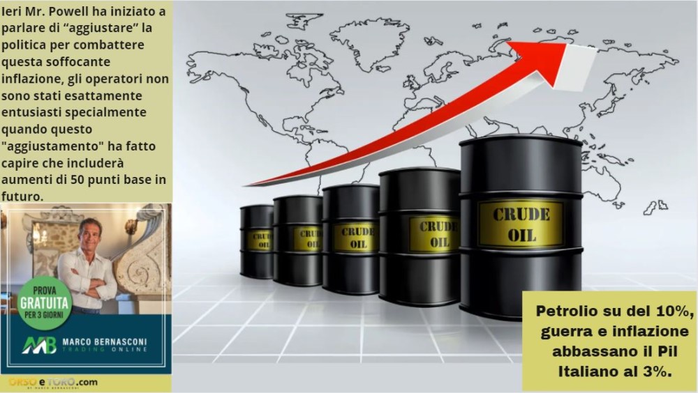 Petrolio su del 10%, guerra e inflazione abbassano il Pil Italiano al 3%.