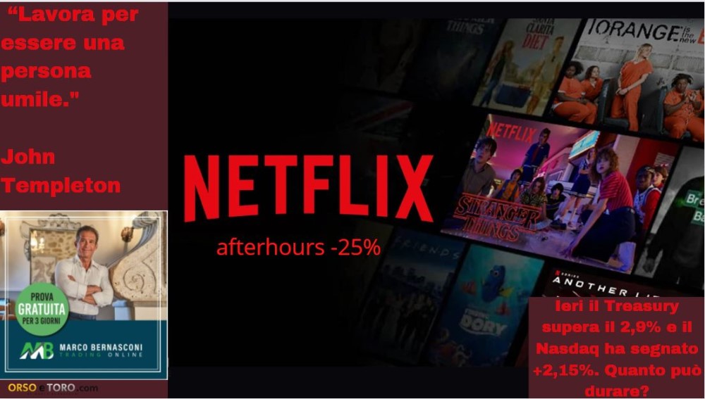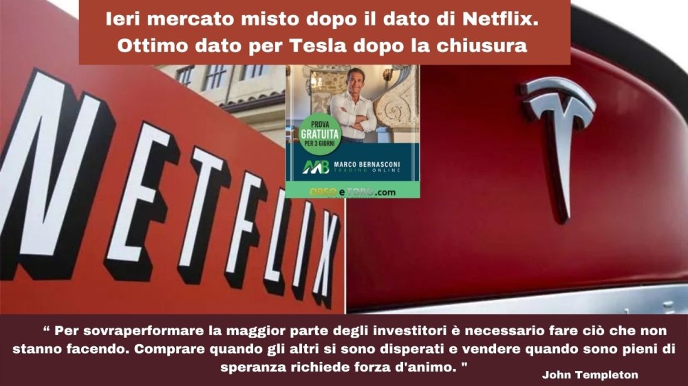 Ieri mercato misto dopo il dato di Netflix. Ottimo dato per Tesla dopo la chiusura