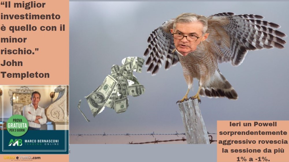 Ieri un Powell sorprendentemente aggressivo rovescia la sessione da più 1% a -1%.