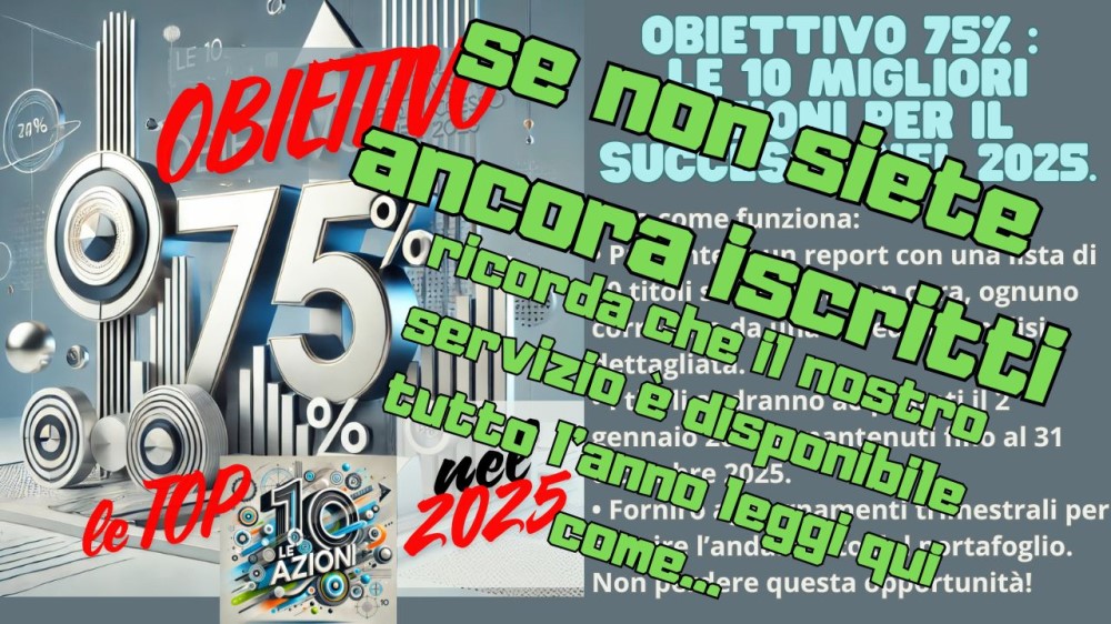"Obiettivo 75%: Le 10 Migliori Azioni per il Successo nel 2025", sarà un percorso lungo un anno e quindi non vi preoccupate se non vi siete ancora iscritti SIETE ANCORA IN TEMPO A FARLO