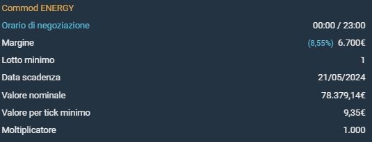 Se si usa un moltiplicatore 1.000, ogni 100 centesimi di movimento del petrolio WTI corrispondono a 1.000$ (esempio: se sono posizionato long e il petrolio WTI passa da 78$ a 79$ allora l'operazione ha reso 1.000$).Margine per aprire 1 contratto 6.700€.