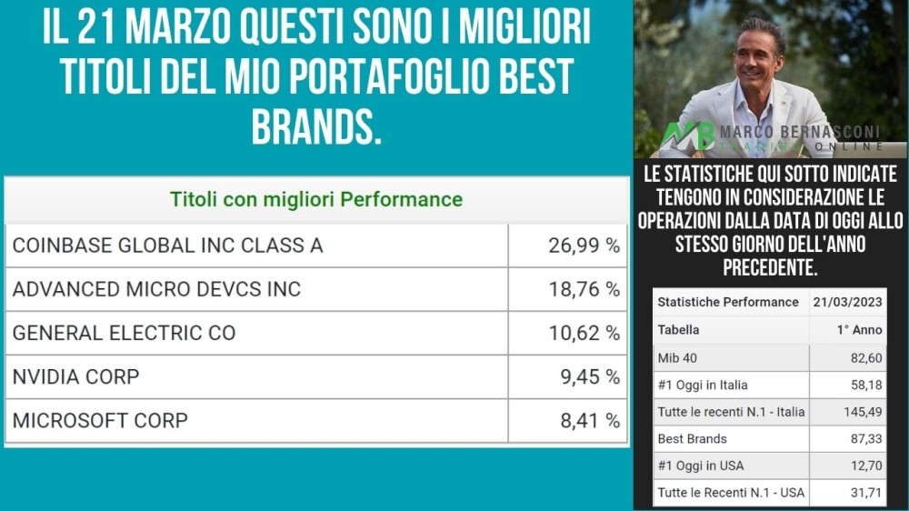 Iniziamo col portafoglio Best Brands. Al 21 Marzo, i titoli con le migliori performance erano Coinbase Global Inc Class A (+26,99%), Advanced Micro Devcs Inc (+18,76%), General Electric Co (+10,62%), Nvidia Corp (+9,45%) e Microsoft Corp (+8,41%). Sorprendentemente, non c'è alcun titolo con la peggiore performance, il che dimostra l'efficacia di questo portafoglio.