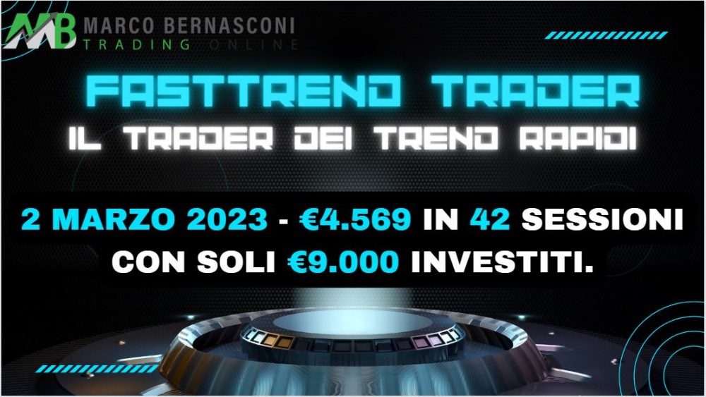 2 marzo 2023 "FastTrend Trader" di Marco Bernasconi. €4.569 in 42 sessioni con soli €9.000 investiti.